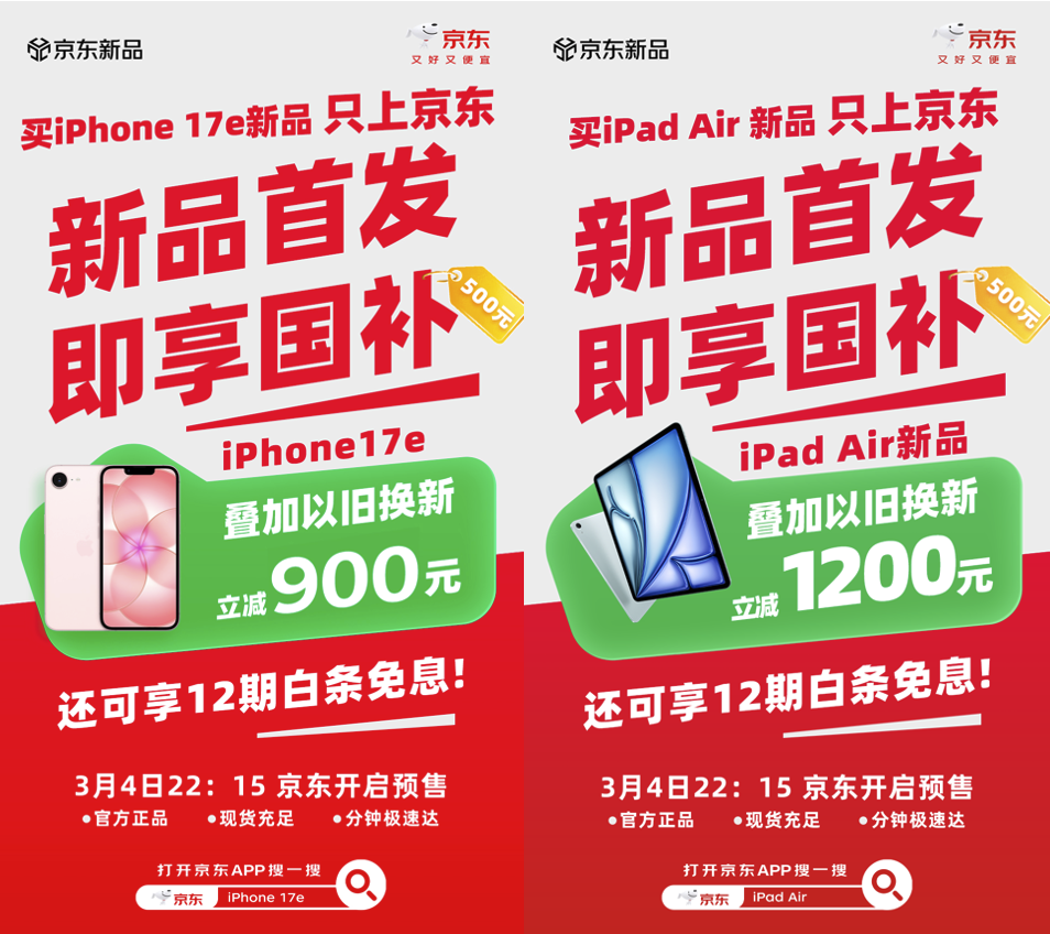2026年3月2日晚10点,苹果春季新品发布会定期举行,本年,苹果冲破传统发布节律,初次接受“连气儿三天上新”形状,拉开2026年家具焕新的序幕。当晚,iPhone 17e与2026款iPad Air同步亮相,起售价辩别为4499元、4799元,均于3月4日晚10:15接受预购,3月11日发售。目下,两款新品已在京东开启预约通谈。用户可怒放京东App搜索“苹果新品福利”直达行径页面,新品首发即可享国补福利,iPhone 17e加量不涨价重复以旧换新立减900元,iPad新品重复以旧换新立减1200元。